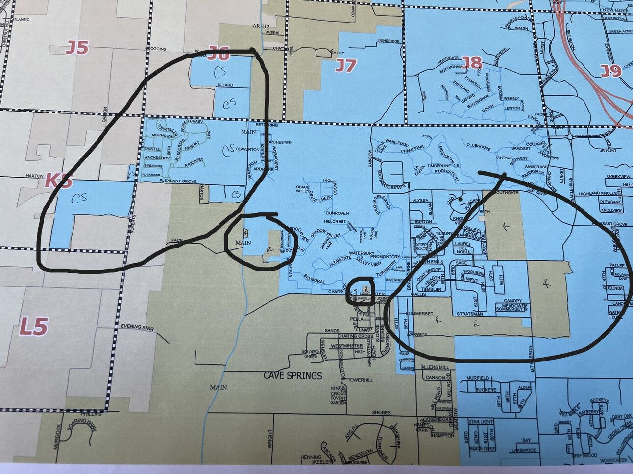 Map provides a rough estimate on what land will be flipped - blue marked with CS is moving from Rogers to Cave Springs, green marked with R is moving from Cave Springs to Rogers