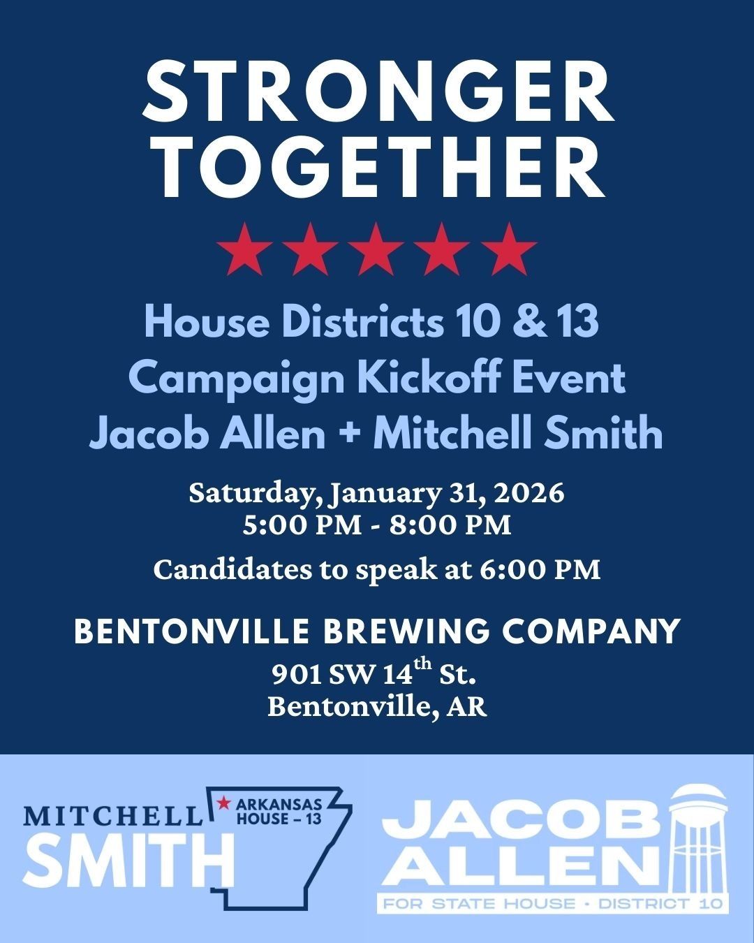 State Legislature: Candidate Kick Off Event for Jacob Allen in House District 10 (North Bentonville and south/central Bella Vista) and Mitchell Smith in House District 13 (South Bentonville and NW Rogers) in Bentonville: