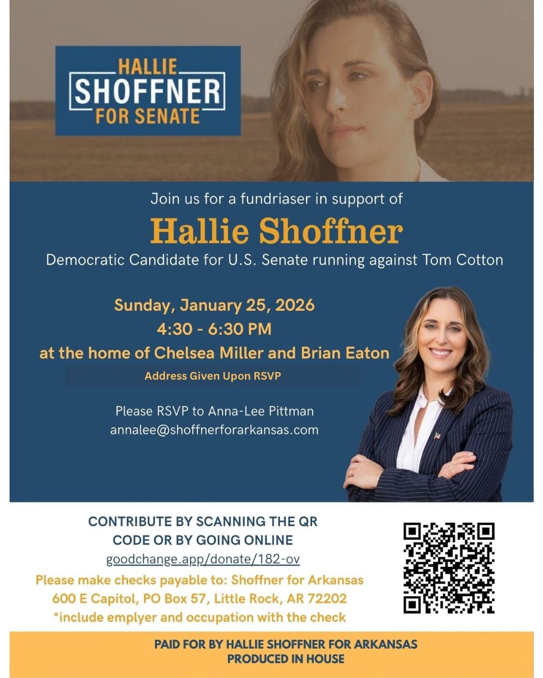 Arkansas U.S. Senate: Candidate Hallie Shoffner (all Arkansas voters in the Democratic primary) fundraiser in Rogers: