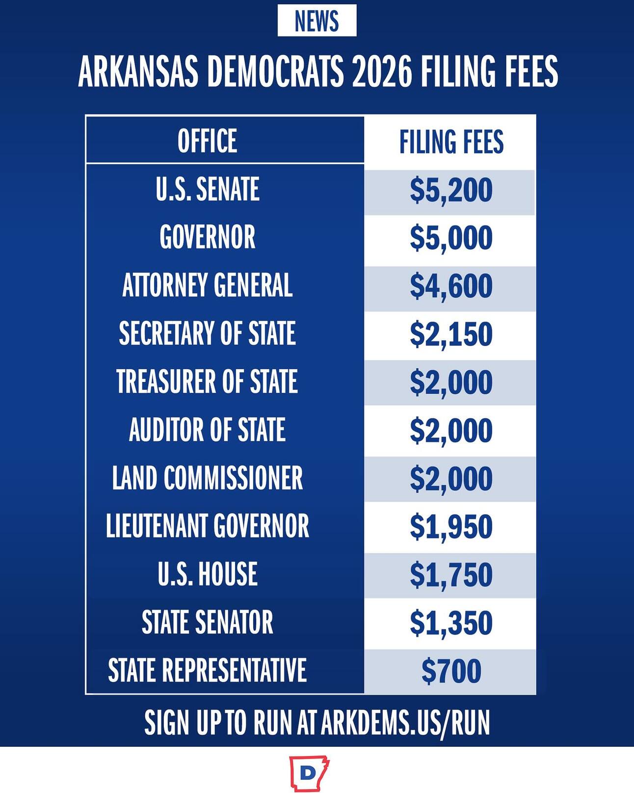 Filing fees to run as a Democrat have been decided for the 2026 - Note, there will be a method to avoid paying the fee by collecting signatures for state legislative offices that are not currently held by Democrats -rules for the signature gathering option are coming soon